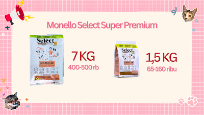Sedikit informasi nih, kalau Monello Select Skin & Coat tersedia dalam 2 varian kemasan freshpack, yaitu kemasan 7 kg dan 1,5 kg. Untuk varian kemasan 7 Kg harganya itu berkisar antara 400-500 rb-an saja, sedangkan kemasan 1,5 kg berkisar di harga sekitar 65-160 ribu rupiah.